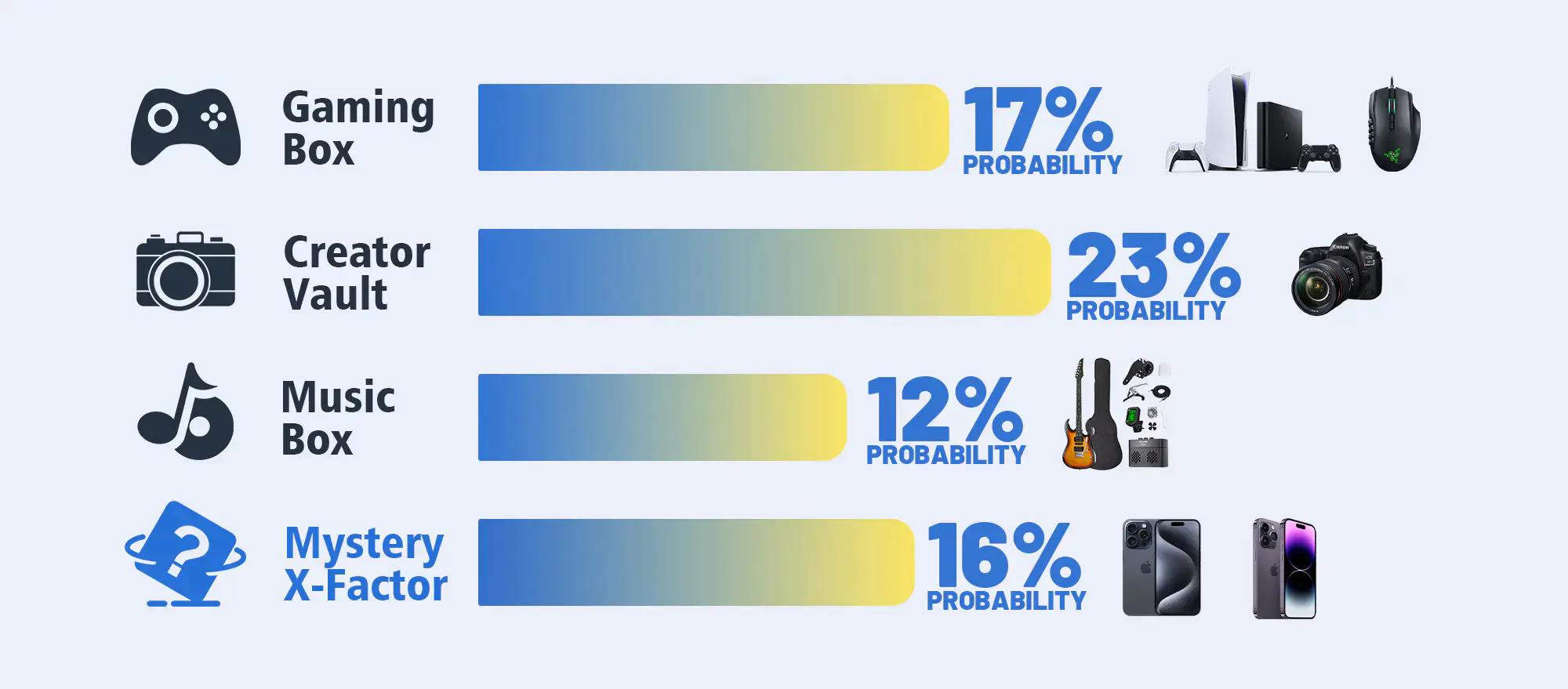 A: Mystery Boxes come in three different sizes - small, giant and super giant. The bigger the box, the greater the chance that you will receive the most valuable products. Good luck to everyone :)